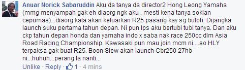 “aku dah nanya direktur-direktur Hong Leong Yamaha (……) mereka akan ngeluarin R25 rakit di Sungai Buloh. Diperkirakan dilaunching pada kuartal pertama tahun depan. Inipun karena aku tanya bertubi-tubi. Dan aku katakan Honda dan Yamaha Indonesia taak sabar mau race di ARRC. Kawasakipun mau ikut gini… so HLY terpaksa juga pake R25. Boon Siew akan launching CBR250R tanggal 27 ini.