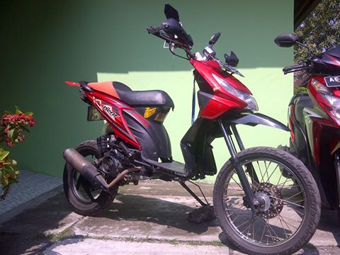 Kenapa A’A menyebutnya dengan sebutan jerapah? Tak lain tak bukan karena ketinggiannya mas bro… jan jangkung tenan. Bisa dilihat penampakannya ketika dijejerkan dengan Honda Vario. Kira kira siapa ya ownernya dan terinspirasi dari mana modifnya sehingga menjadikan Honda Beat ini menjadi matik dual purpose… unik nan pokoke…