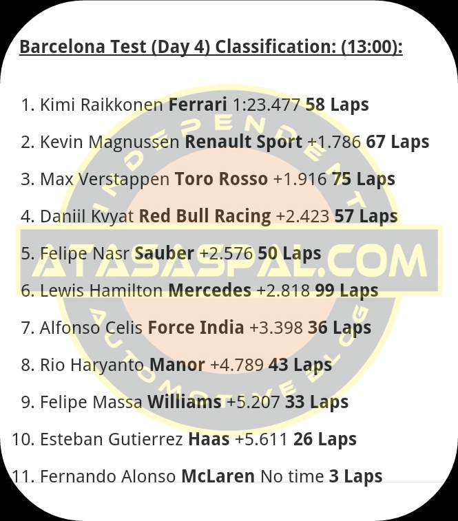Yup, catatan waktu Rio Haryanto pada tes hari keempat sesi pagi ini lebih lambat +4.789 dari Kimi Raikkonen yang menjadi pembalap tercepat pada sesi ini. Pun demikian, catatan Rio ini kebih baik dari pembalap tenar semisalal Felipe Massa.