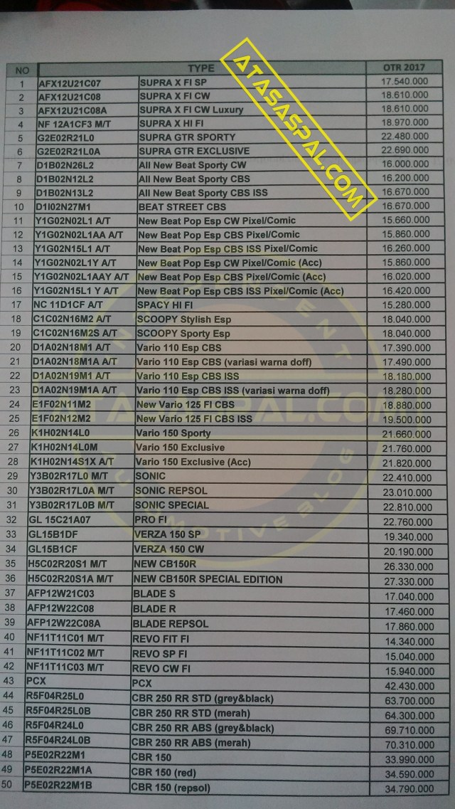 atasaspal.com – Bro Sist…. Akhirnya sudah terkonfirmasi bahwa harga motor Honda terkoreksi naik per bulan Januari 2017. Adapun kenaikan ini terjadi mungkin karena efek domino dari pp no.60 2016 yang diberlakukan beberapa waktu lalu, yang mana mau tidak mau Pabrikan juga harus menyesuaikan dengan kebijakan Pemerintah tersebut. Kenaikan harga sendiri cukup bervariasi antara 350 sampai dengan 510 ribu rupiah tergantung model dan tipe… Penasaran dengan Harga yang berlaku sekarang? Hayuk lanjut membaca…