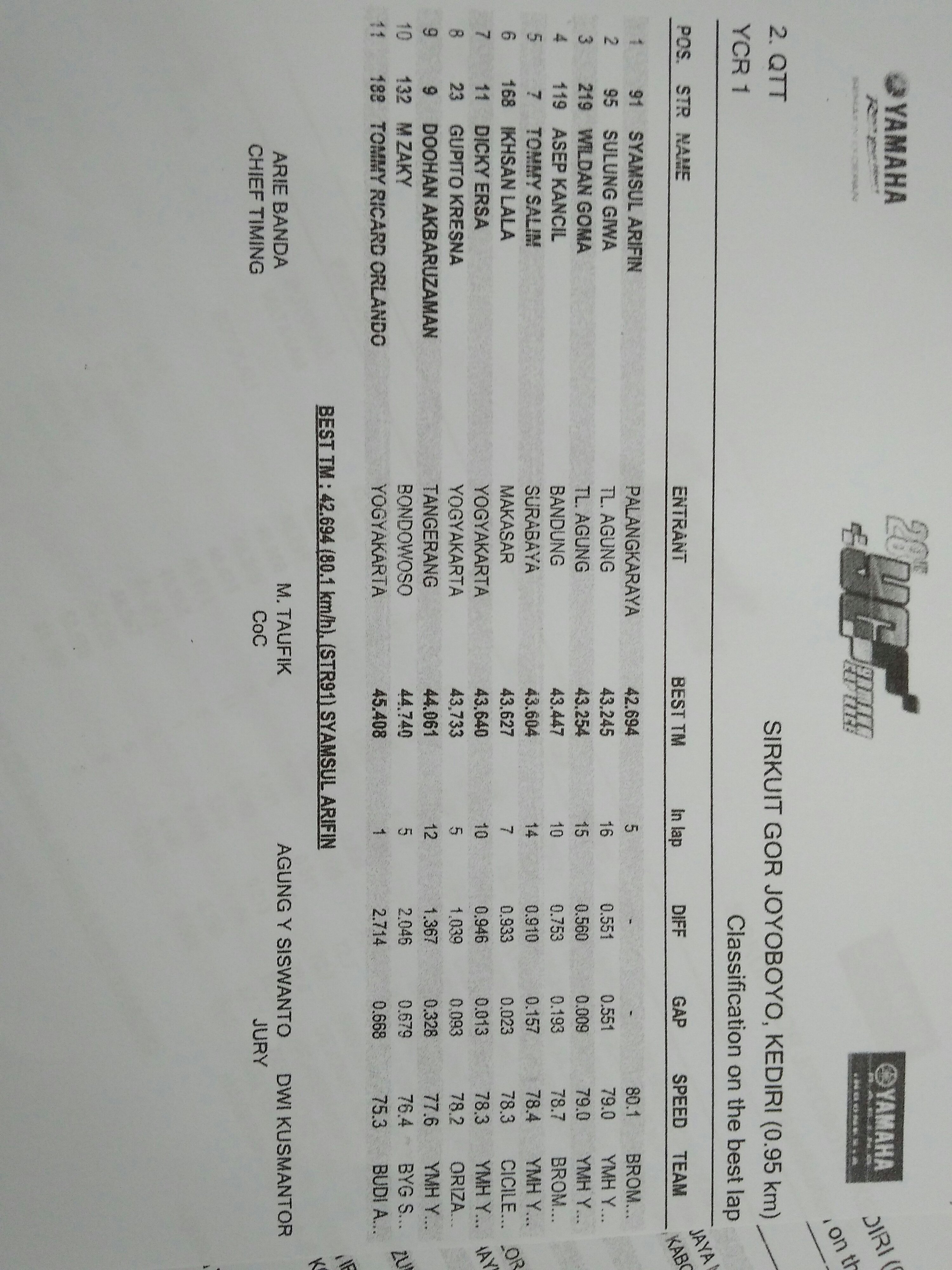 Berikut ini hasil kualifikasi kelas YCR 1 Moped 150cc Tune Up Seeded *FI, YCR Seri 2 Kediri