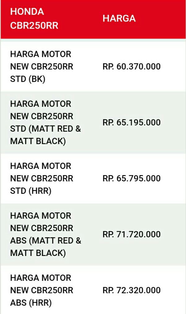 atasaspal.com – cak…. menjadi motor fairing dengan desain yang garang bak predator, Honda CBR250RR juga lahir dengan dibekali dengan power maksimum 38.7 @12.500 rpm yang mana menjadi yang paling besar dikelas 250cc Indonesia. Dipasarkan dengan pilihan warna Brevery Mat Red, Black Freedom, Racing Red dan juga Mat Gunpower Black Metalic. Lalu pertanyaannya, berapakah harga terbaru sang twin cylinder tersebut di Tulungagung?