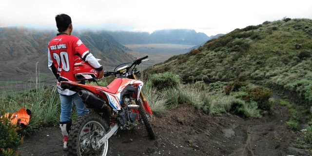 Singkat cerita, briefing selesai… memanjatkan do’a… dan peserta bergegas ke Honda CRF150L masing-masing…. Bismillah budal cak…. peserta bergerak menuju Bromo membelah jalanan aspal Malang Raya selama lebih kurang 1 jam lamanya sebelum akhirnya sampai dipintu masuk Bromo via Tumpang…. jalanan aspal yang terbentang menyajikan kesan tersendiri karena baru pertama kali inilah A’A riding dengan motor trail yang bannya sudah digembosi… Hal ini wajar saja karena dilakukan untuk mengakomodir kebutuhan offroad didepan…. rak yo lucu nrabas tapi ban e atos… iso mlese-mkese tenan cak…