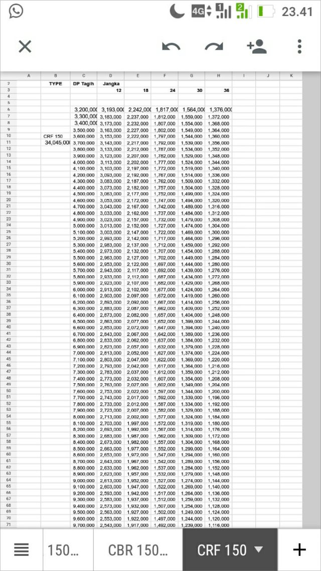 Dikirimkan oleh sist Runi, KaryaAgung Motor, Boyolangu Tulungagung, melalui aplikasi pesan whatsapp diketahui sekarang bahwa harga CRF150L Tulungagung sebesar Rp 30.045.000.- cak… hmmmm…. masih sana dengan nulan Juli lalu alias nelum ada kenaikan harga nih…. itu untuk pembelian secara cash ya… sementra itu untuk pembelian secara kredit, berapakah uang muka minimal untuk menebus motor trail Honda ini? Monggo semak saja gambar dibawah ini…