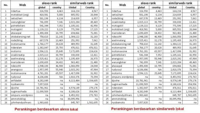 Untuk itu, agar lebih lengkap, data dikategorikan kedalam 2 kategori dari Alexa Ramg dan Similiarweb yakni lokal dan global. Ternyata para Blogger senior yang kalem dalam kesehariannya menempati 3 posisi teratas untuk kedua kategori.