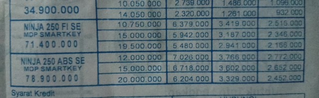 - New Ninja 250 fi ABS SE MDP SMARTKEY Rp 78.900.000.-