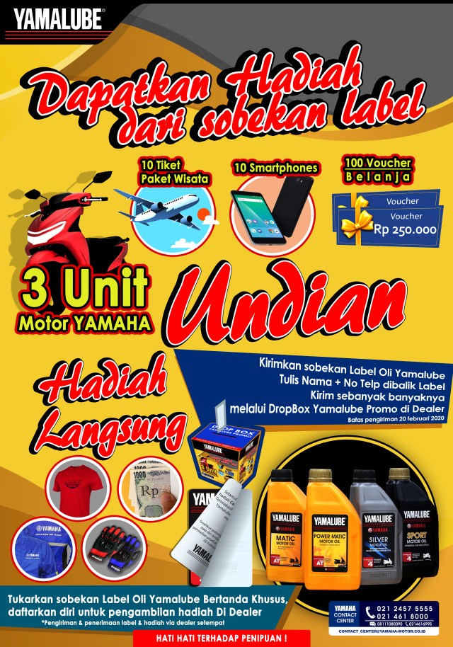 Jika belum beruntung, kalian dapat mencoba cara kedua yaitu dengan mengikuti undian, caranya sobek label oli Yamalube dan masukkan ke dalam drop box yang tersedia di seluruh jaringan resmi Yamaha Indonesia atau toko sparepart kepercayaan anda. Dengan mengikuti undian ini kalian berkesempatan mendapatkan hadiah grand prize, seperti sepeda motor Yamaha, paket wisata, smartphone, dan voucher belanja yang akan diundi pada bulan Agustus 2020.