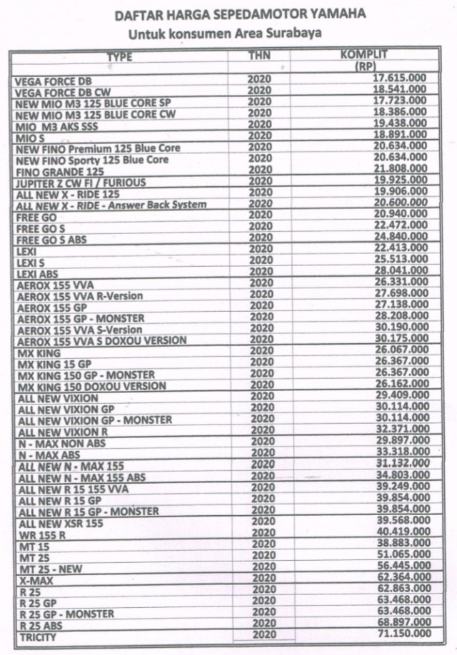 Dan untuk update berbagai motor Yamaha untuk kota Surabaya dan sekitarnya di Jatim yang masuk kedalam wilayah pemasaran PT.STSJ untuk bulan Agustus 2020, monggo simak saja gambar diatas itu ok?
