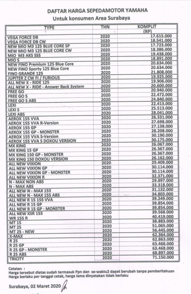 Mengutip dari web Yamaha Jatim, dari 2 Maret 2020 sampai dengan saat ini tidak ada kenaikan harga satu sen pun. Sungguh suatu berkah untuk masyarakat Jatim yang berada dalam wilayah pemasaran PT. STSJ. Kenapa? Monggo Panjenengan intip keluar area karena disana ada pergerakan harga sedangkan Jatim tetap adem ayem. Mantab tenan kan cak…
