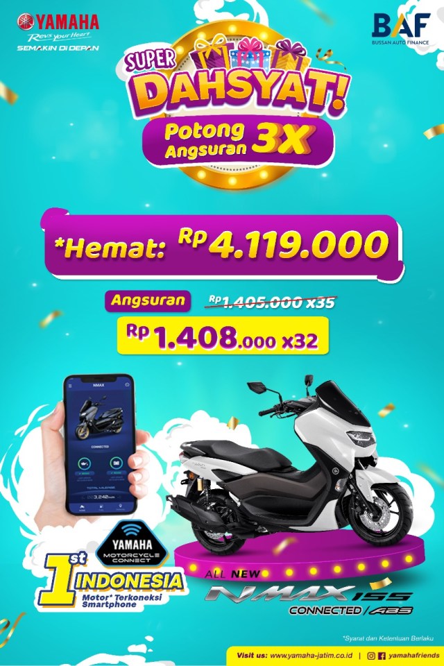 Konsumen yang ingin mendapatkan Promo Super Dahsyat bisa langsung mengunjungi dealer terdekat. Varian ALL New NMAX ABS terbaru hemat hingga 4 jutaan. Tidak hanya NMAX, promo Super Dahsyat ini juga berlaku untuk pembelian motor Lexi dan FreeGo. Angsuran motor Lexi bisa hemat sampai 3,4 jutaan dan FreeGo hemat sampai 1,5 jutaan.