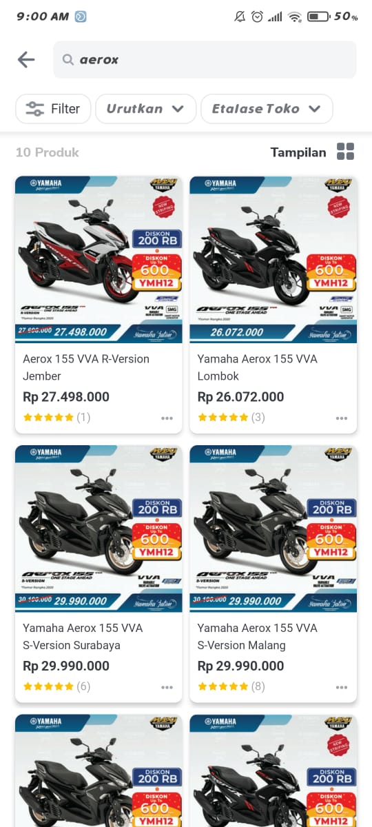 Bagi anda yang belum memiliki aplikasi Tokopedia, dapat segera menginstallnya di app store maupun play store secara gratis. Kemudian ketik di kolom pencarian @yamahajatimofficial dan pilih yang bercentang verified, selanjutnya anda dapat memilih motor yang diinginkan.