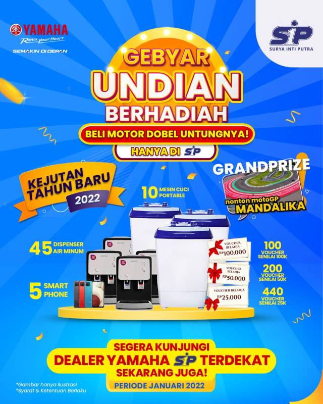Hanya dengan melakukan pembelian unit sepeda motor Yamaha all type di seluruh Dealer resmi Yamaha yaitu Surya Inti Putra (SIP), konsumen berkesempatan untuk mendapatkan kupon undian. Program ini menawarkan hadiah hingga puluhan juta rupiah!