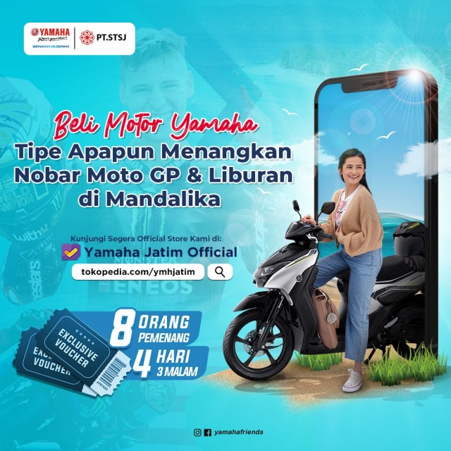 Kali ini, spesial bagi konsumen yang melakukan pembelian motor Yamaha di tokopedia Yamaha Jatim Official atau http://www.tokopedia.com/ymhjatim pada bulan Januari – Februari 2022 berkesempatan mendapatkan hadiah liburan dan nonton langsung Moto GP di Mandalika gratis untuk 4 hari 3 malam untuk 8 orang pemenang.