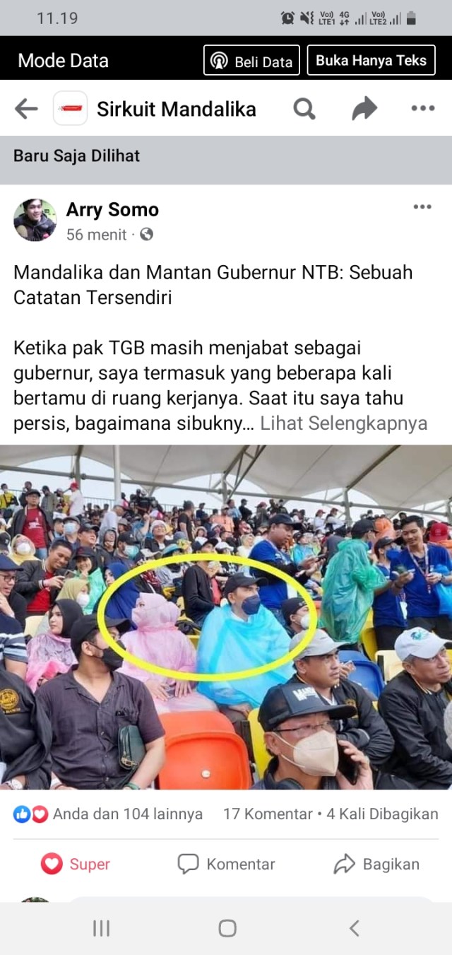 Saat jemari ini berselancar di facebook, menemukan sebuah postingan di grup Sirkuit Mandalika yang di Upload oleh Bro Arry Somo yang secara garis besar menginfokan bahwa TGB beserta istri berada di tribun B berbaur dengan para penonton lainnya. Dan bahkan saat Pak Jokowi mengajak beliau untuk ke tribun VVIP, beliau tetap kekeh untuk berada disana. Seperti apa kisahnya? Berikut ini tulisan lengkapnya.
