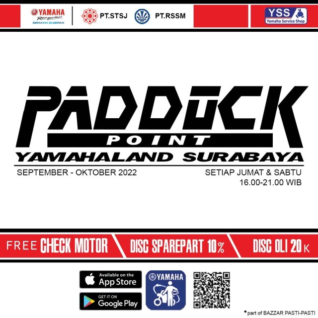 “Sebagai wujud nyata dari komitmen kami untuk terus memberikan pelayanan terbaik bagi Konsumen setia, kami menghadirkan layanan Paddock Point. Harapan kami, konsumen semakin termotivasi untuk melakukan perawatan kendaraan dengan adanya service yang semakin mudah dan praktis,” ungkap Ilham Wahyudi, General Manager Service & Sparepart Yamaha STSJ.