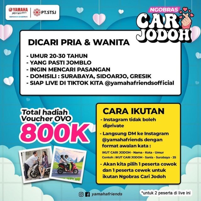 Langsung DM instagram @Yamahafriends dengan mengetik awalan kata : IKUT CARI JODOH – (Nama) – (Domisili) – (Umur).