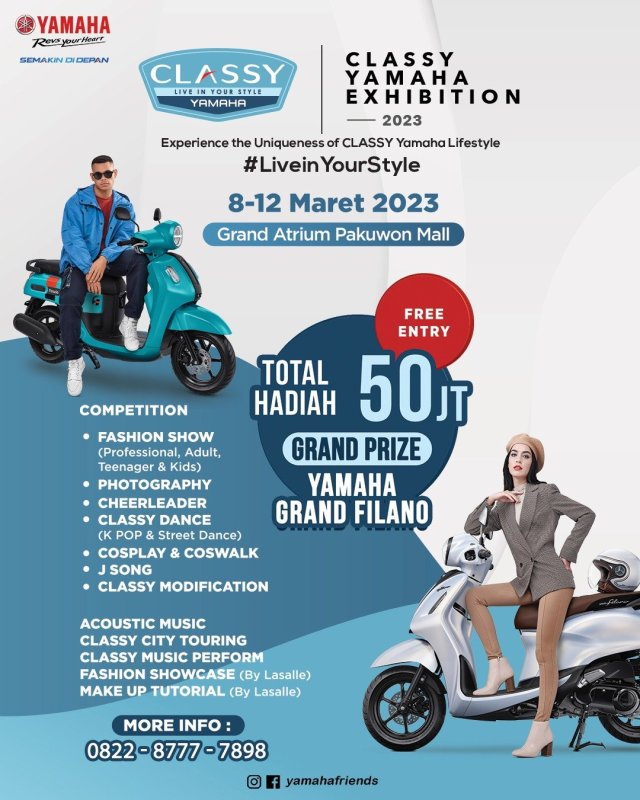 Kegiatan yang bertajuk Classy Exhibition ini akan menampilkan produk-produk terbaru keluaran Classy Yamaha yaitu Yamaha Fazzio Hybrid-Connected dan Yamaha Grand Filano Hybrid-Connected.