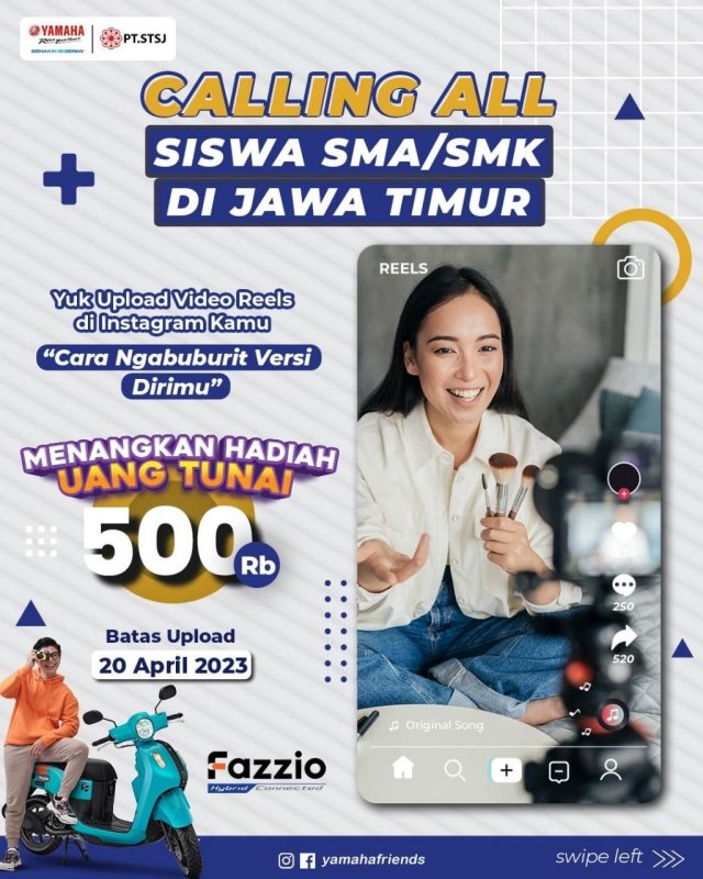 atasaspal.com – PT. Surya Timur Sakti Jatim (Yamaha STSJ) selaku distributor resmi Yamaha area Jawa Timur, Kalselteng, Kaltim, dan Nusa Tenggara kembali hadir memberikan tantangan bagi generasi muda masa kini. Tantangan ini berupa ‘Ngabuburit Reels Competition’. Kompetisi ini digelar mulai dari tanggal 13 April hingga 20 april 2023 dan boleh diikuti oleh siswa/siswi SMK/SMA se Jawa Timur.