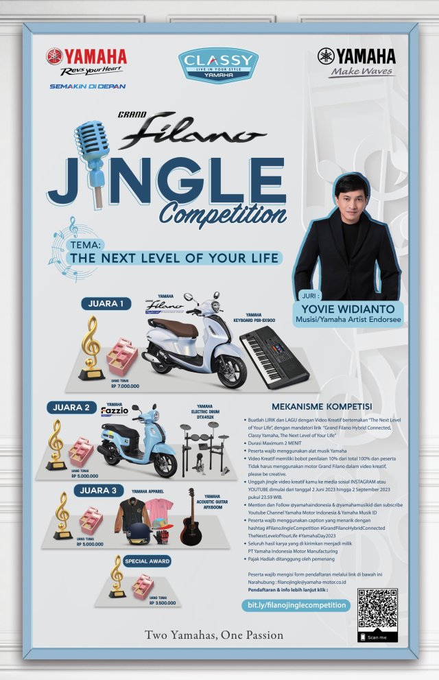 Selain membawa produk unggulan di kelasnya, Grand Filano Jingle Competition juga menggandeng seorang musikus ternama Indonesia, Yovie Widianto sebagai juri utama yang sudah berpengalaman dan berkecimpung di dunia musik Indonesia. Setiap karya musik yang masuk akan dilakukan penilaian oleh juri utama dan tim Yamaha hingga mendapatkan karya terbaik. Hasil karya musik terbaik dari para pemenang jingle competition akan disebarkan melalui media promosi Yamaha seperti Iklan TVC, Challenge, Konten Media Social, dan lainnya. Selain itu, Yamaha juga menyediakan total hadiah puluhan juta rupiah untuk hasil karya terbaik pilihan juri dan tim Yamaha, diantaranya :