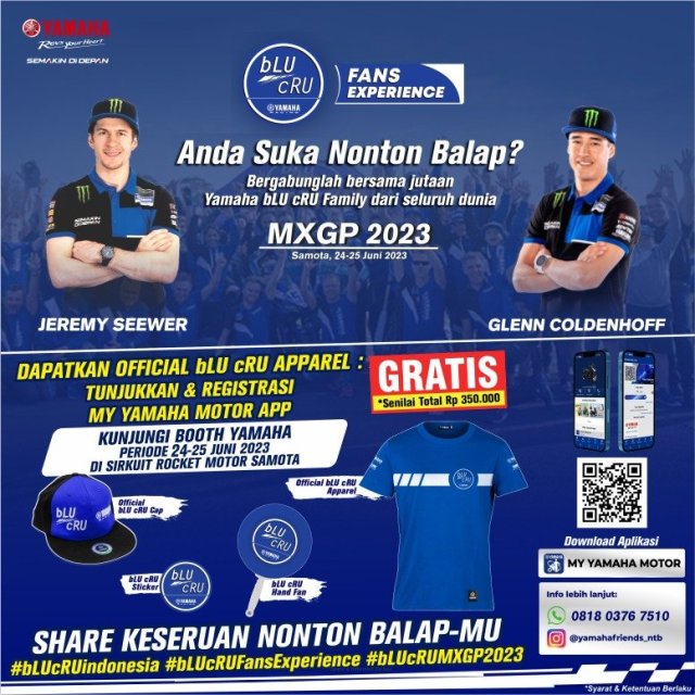 “Melalui bLU cRU Fans Experience kami mengajak seluruh konsumen Yamaha untuk semakin memperkuat ikatan, enjoy, dan semakin connect melalui rangkaian kegiatan yang telah disiapkan. Kami harap konsumen, komunitas, maupun fans bisa mendapatkan experience yang menyenangkan di ajang MXGP 2023 kali ini,” ungkap William Saputra, Manager Promosi Yamaha STSJ.