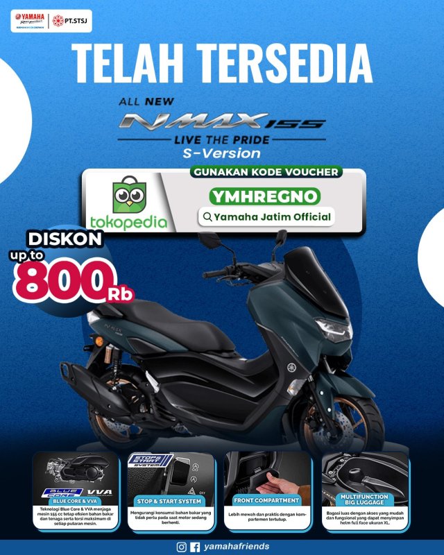 Spesial bagi konsumen yang ingin memiliki skutik penjelajah Yamaha All New NMAX 155 S-Version, konsumen bisa mendapatkan potongan harga hingga Rp 800 ribu. Program ini dapat dinikmati bagi konsumen yang melakukan transaksi online melalui Marketplace Yamaha di Tokopedia. Dengan menggunakan kode voucher YMHREGNO , konsumen sudah bisa menikmati potongan harga yang diberikan oleh Yamaha STSJ.