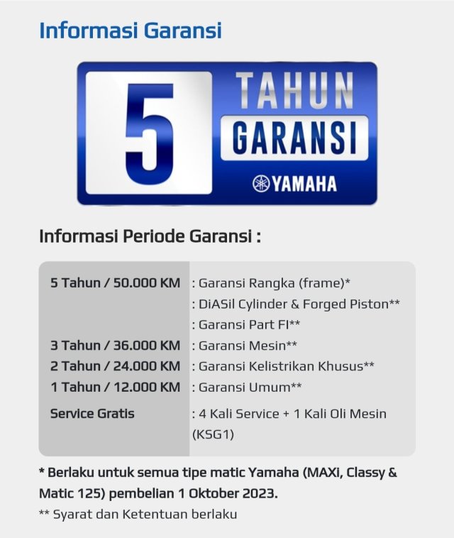 Nah… Selain faktor diatas, tentunya ada hal lainnya yang menarik untuk dibahas tentang klaim garansi, khususnya klaim garansi 5 tahun Yamaha yang mana pada tahun 2023 ini Yamaha memperpanjang garansi rangka dari yang semula 1 tahun atau 12.000 km berubah menjadi 5 tahun atau 50.000 km. Apakah proses klaim tersebut dikenakan biaya ataukah malah gratis.