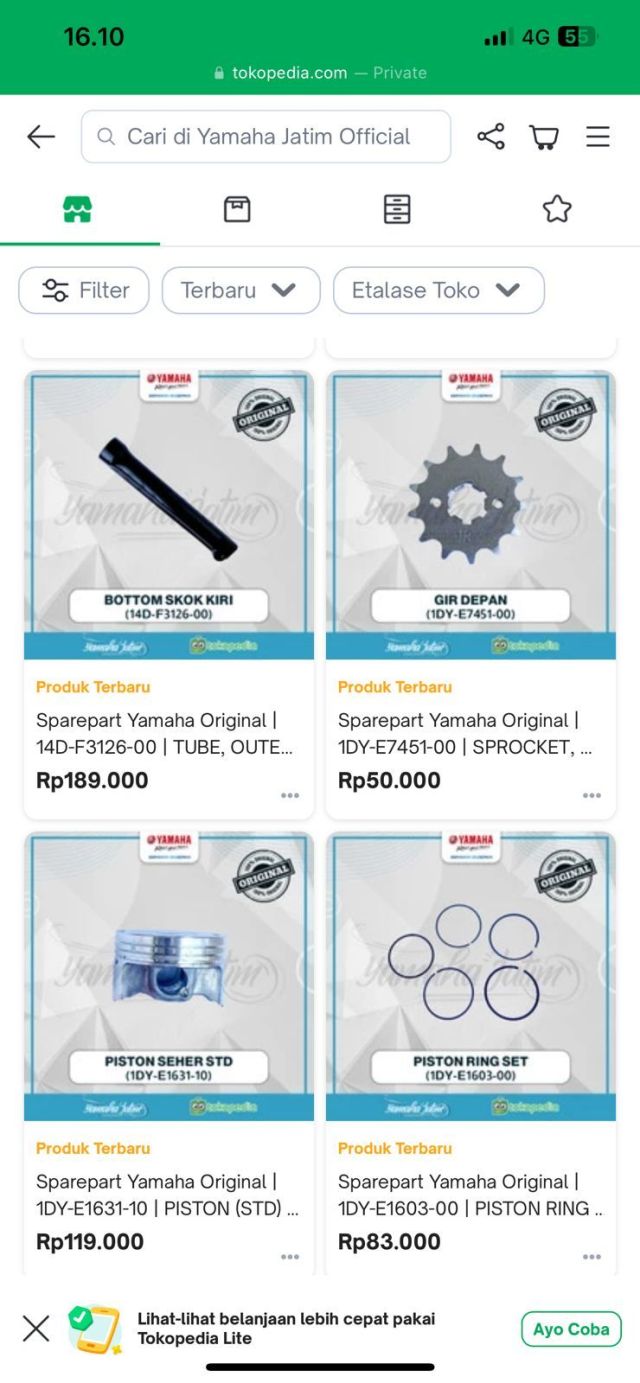 Per tanggal 14 Desember 2023, konsumen dapat mengunjungi toko online resmi Yamaha di Tokopedia yaitu Yamaha Jatim Official atau melalui link tokopedia.com/ymhjtm. Tentunya konsumen dapat membeli Yamaha Genuine Parts atau suku cadang asli yang sudah dijamin kualitas dan keasliannya.