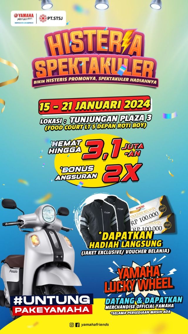 atasaspal.com – PT. Surya Timur Sakti Jatim (Yamaha STSJ) distributor sepeda motor Yamaha area Jawa Timur, NTB & NTT kembali memberikan kabar baik bagi masyarakat. Pasalnya Yamaha STSJ menghadirkan gelaran pameran Histeria Spektakuler dengan memberikan berbagai penawaran menarik dan hadiah spektakuler. Berbagai produk Unggulan dan teknologi terkini dari Yamaha di pamerkan sehingga konsumen dapat melihat dan merasakan langsung keunggulan motor Yamaha. Pameran ini diselenggarakan mulai periode 15 Januari 2024 hingga 21 Januari 2024 di Tunjungan Plaza 3, Surabaya, Jawa Timur.