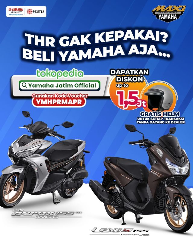 Di Bulan April ini, spesial bagi konsumen yang ingin memiliki motor tipe Classy, Matic, MAXI dan Sport, dapat menikmati promo berupa voucher diskon hingga Rp 1.5 juta. Dengan mengunjungi toko official Yamaha yang ada di Tokopedia yaitu Yamaha Jatim Official atau melalui link http://www.tokopedia.com/ymhjatim dan menggunakan kode voucher YMHPRMAPR konsumen dapat menikmati potongan harga yang telah disiapkan oleh Yamaha STSJ. Selain itu, konsumen juga berkesempatan mendapatkan Helm eksklusif ketika melakukan transaksi.