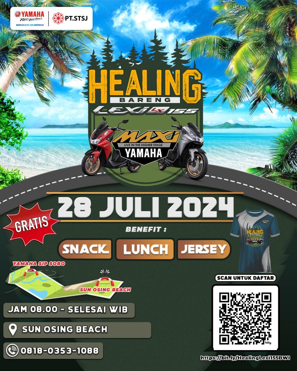 Healing Bareng LEXI LX 155 ini akan digelar pada hari Minggu, 28 Juli 2024 dan peserta akan mendapatkan fasilitas berupa Snacks, Lunch & Jersey. Tentunya kegiatan ini dapat diikuti peserta secara GRATIS. Perjalanan diawali dengan titik pelepasan di Yamaha SIP Sobo dan akan dilanjutkan dengan tujuan akhir di Pantai Sun Osing, Banyuwangi. Peserta dapat mendaftarkan diri melalui barcode yang tertera atau mengunjungi link : https://bit.ly/HealingLexi155BWI.