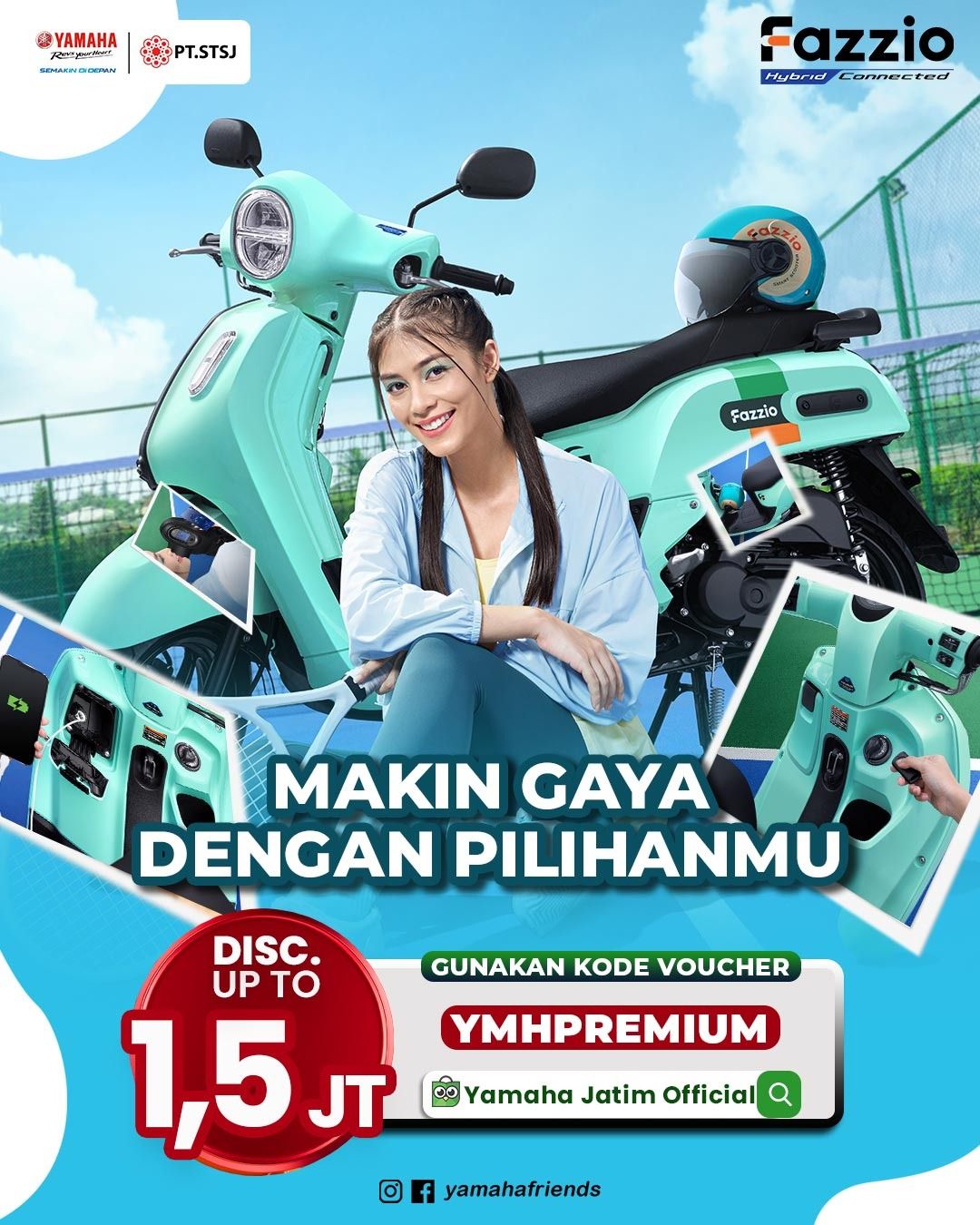 Bagi anda yang mendambakan tampilan stylish dan kece dengan motor hits masa kini, PT. Surya Timur Sakti Jatim (Yamaha STSJ) selaku main dealer motor Yamaha area Jawa Timur, Kalselteng, Kaltim, dan Nusa Tenggara memberikan penawaran spesial bagi konsumen yang melakukan pembelian motor Yamaha Fazzio Hybrid Connected. Program ini sekaligus menjadi bentuk apresiasi dari Yamaha STSJ untuk konsumen setianya.