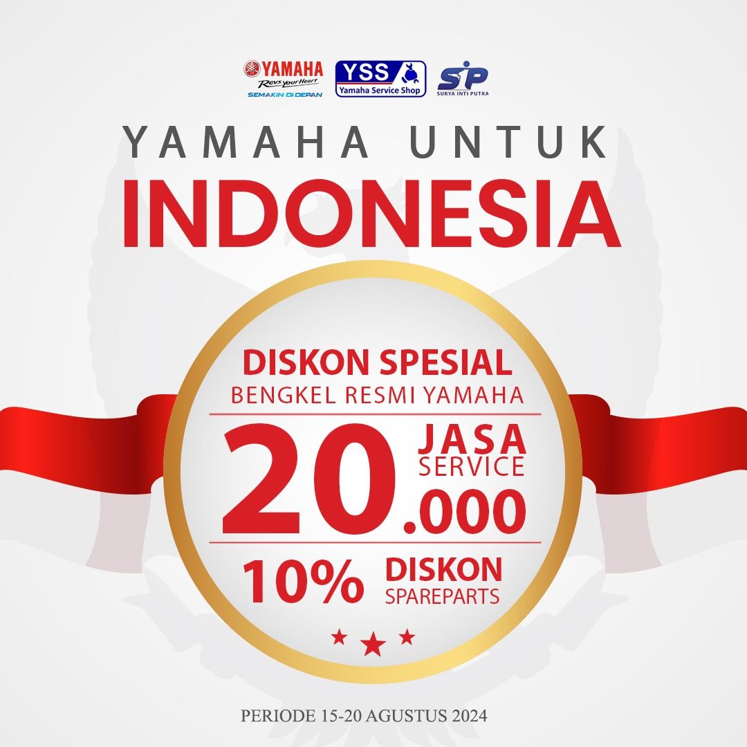 Jangan lewatkan kesempatan emas ini! Segera kunjungi Yamaha Service Shop terdekat dari 15-20 Agustus 2024 dan nikmati berbagai keuntungan dari promo “Yamaha Untuk Indonesia”