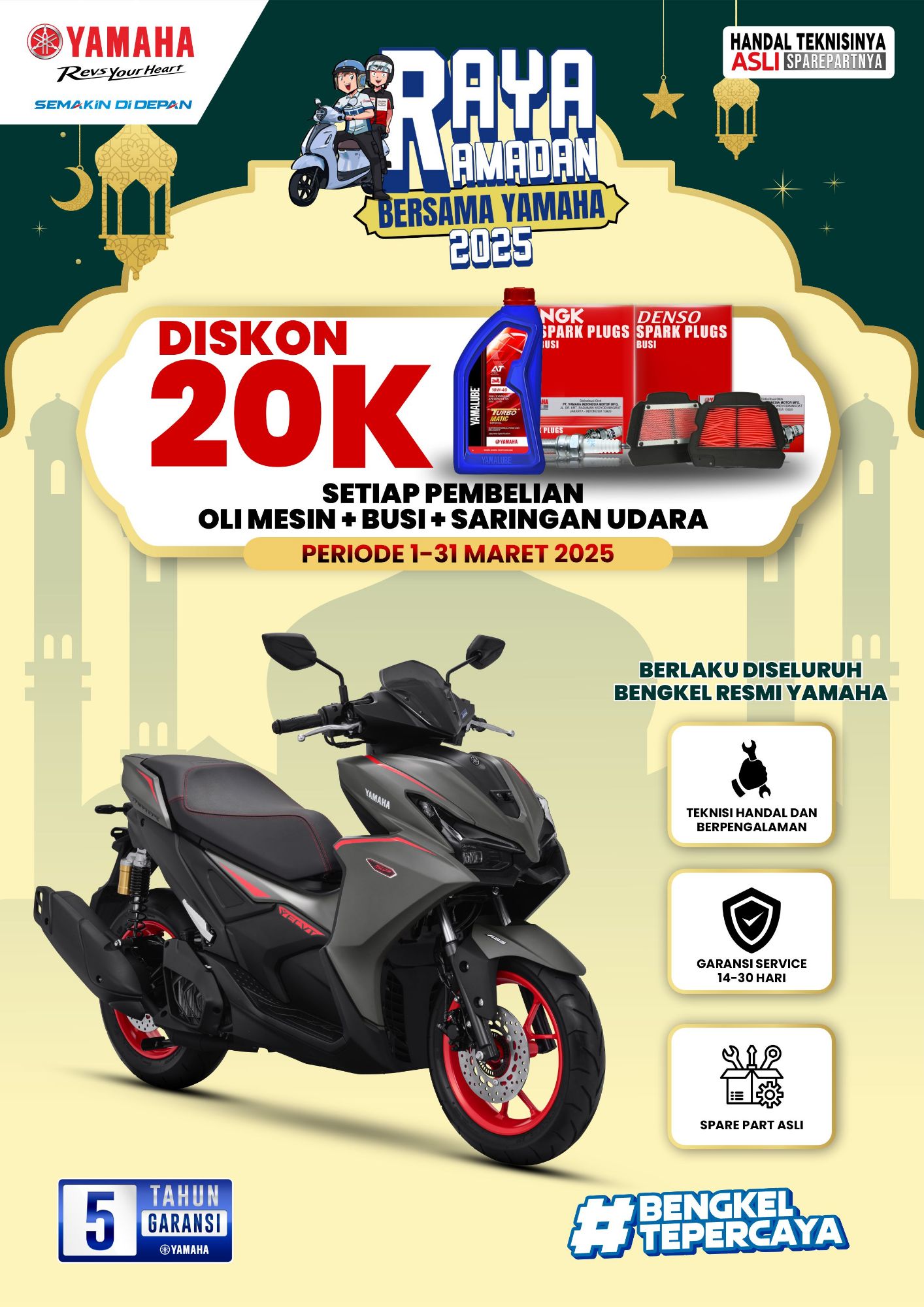 Dalam bulan Ramadhan kali ini Yamaha memberikan promo yakni potongan diskon 20.000 Ribu untuk konsumen yang melakukan service serta melakukan pembelian sparepart Oli, Busi dan filter udara di seluruh bengkel resmi Yamaha Madiun Kediri hingga periode 31 Maret 2025.