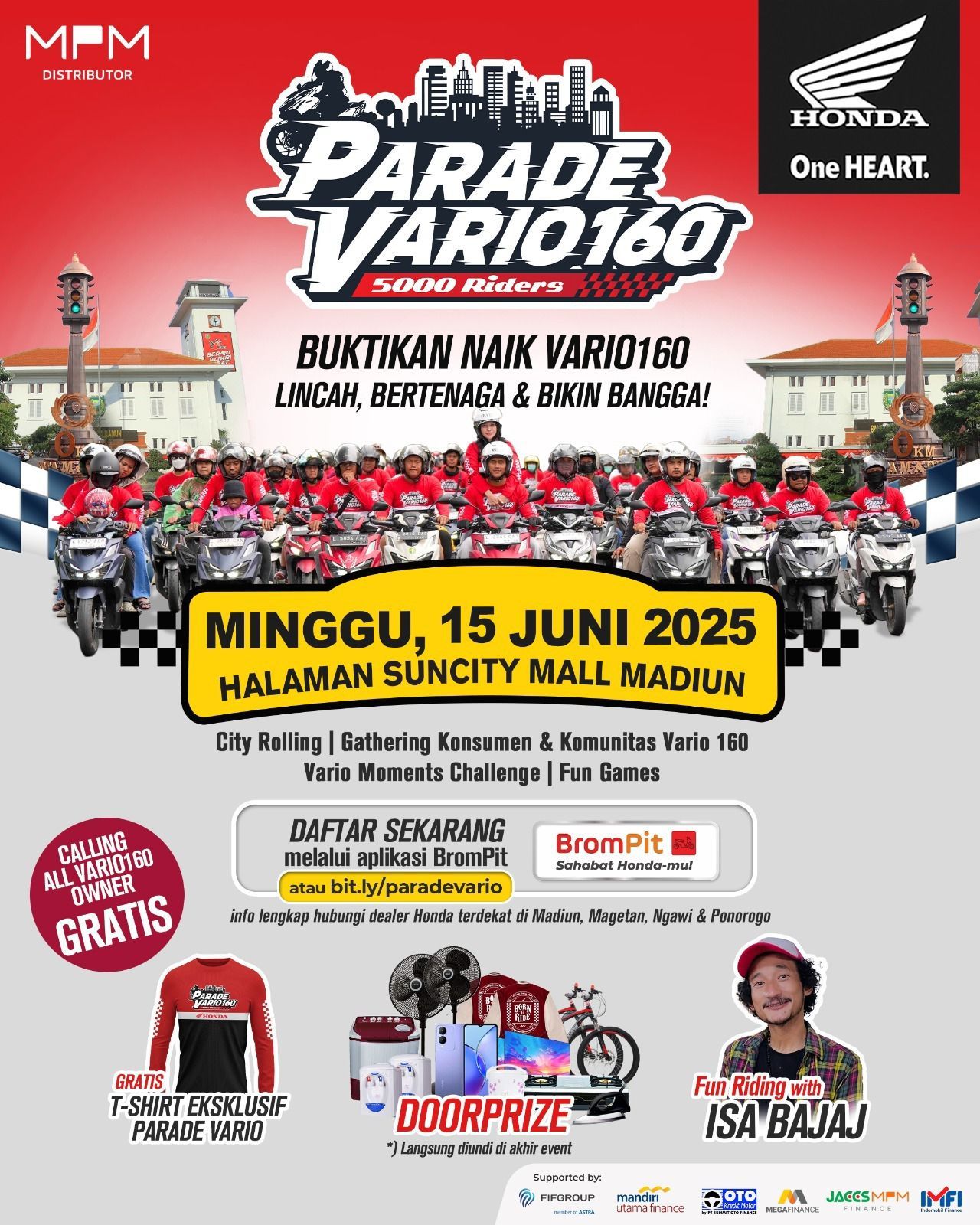 Jangan lewatkan kesempatan langka ini untuk menjadi bagian dari 1.000 riders Honda Vario160 yang akan menunjukkan gaya dan kebanggaan berkendara skutik premium yang lincah, bertenaga, dan membanggakan! Mari bergabung dalam kemeriahan Parade Vario160 di Madiun!